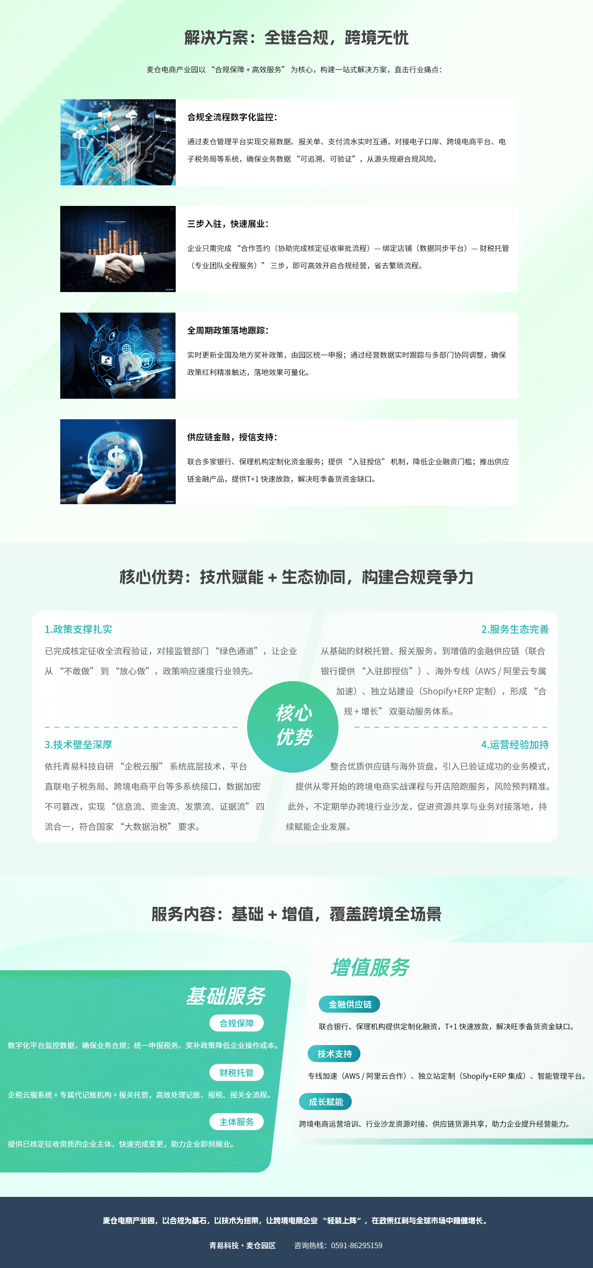 麦仓电商产业园是福建省青易信息科技有限公司倾力打造的跨境电商全链条服务平台,以 “数字化 + 标准化+金融” 为引擎,构建 “主体 + 财税合规 + 托管” 的一体化服务体系。通过打通企业注册、场地租赁、财务记账、税务申报、报关服务、运营指导、人才培养、法务支持、政策解读、数据分析的全流程,同时为企业提供精准化管理工具,推动业务发展生态建设。